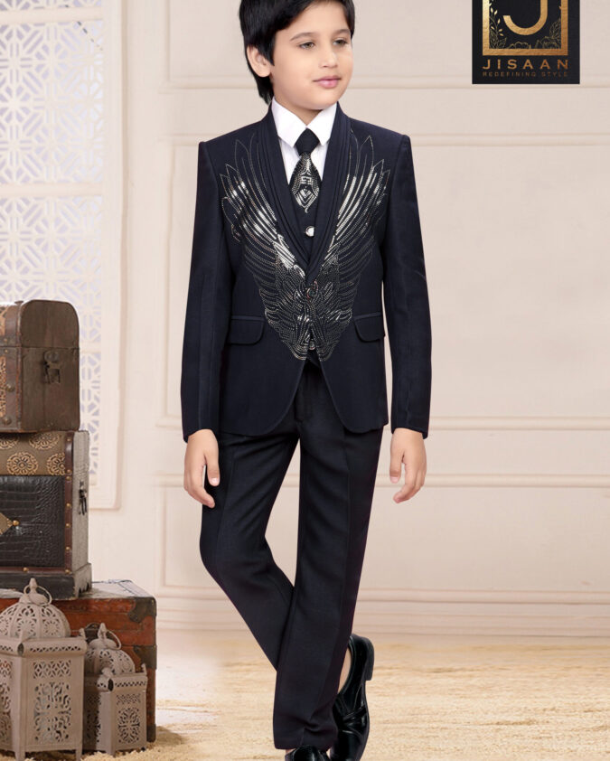 Navy blue suit with metallic wing jacket—modern and sophisticated for celebrations.