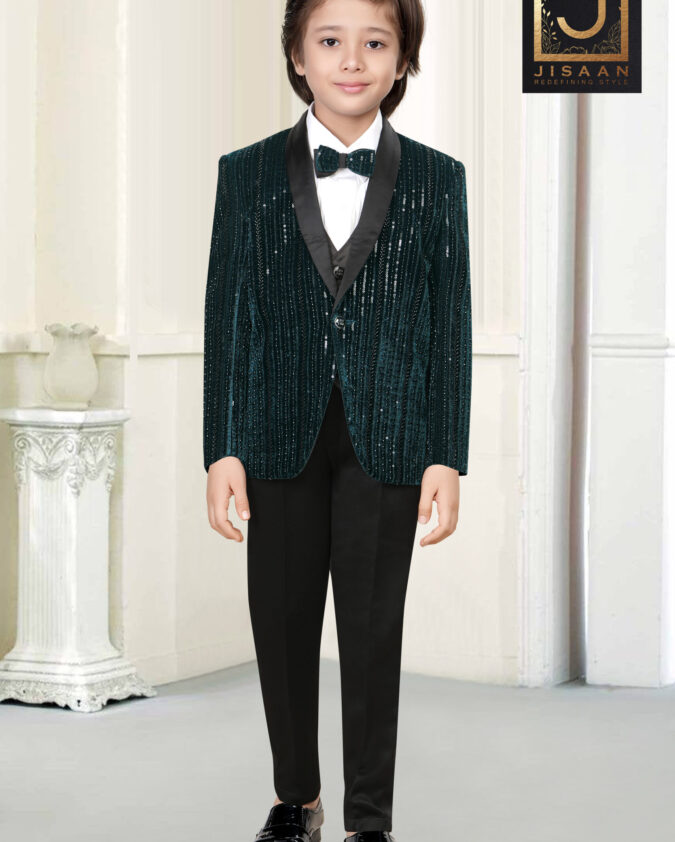 Firozi suit set with satin lapel and bow tie—standout style for parties and formal occasions.