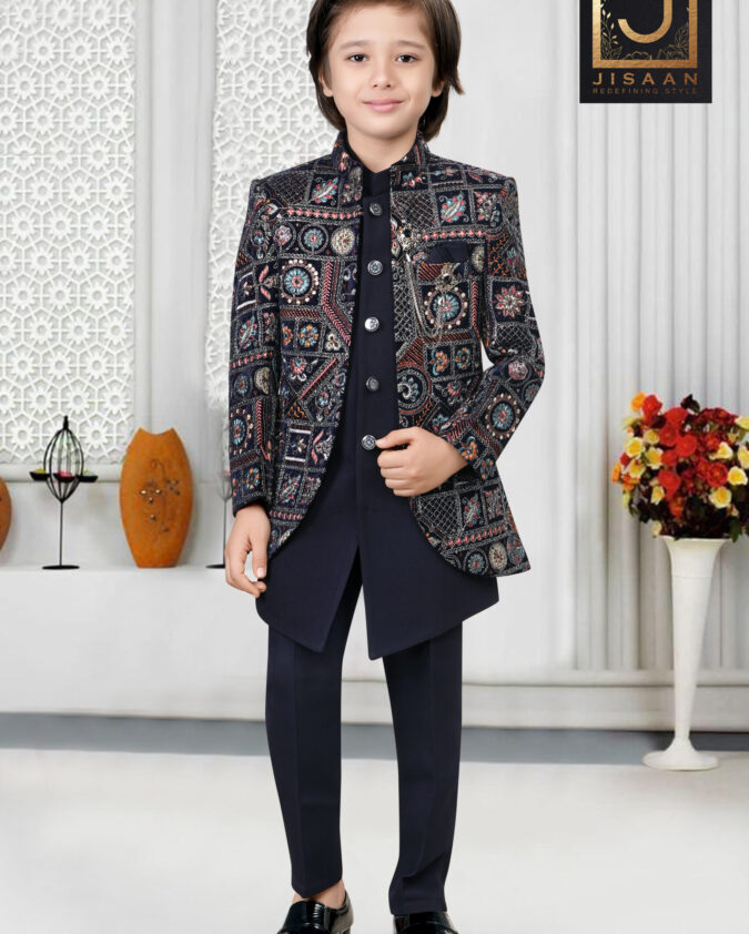 Navy blue Indo-Western suit with embroidered geometric jacket—sophisticated look for special occasions.