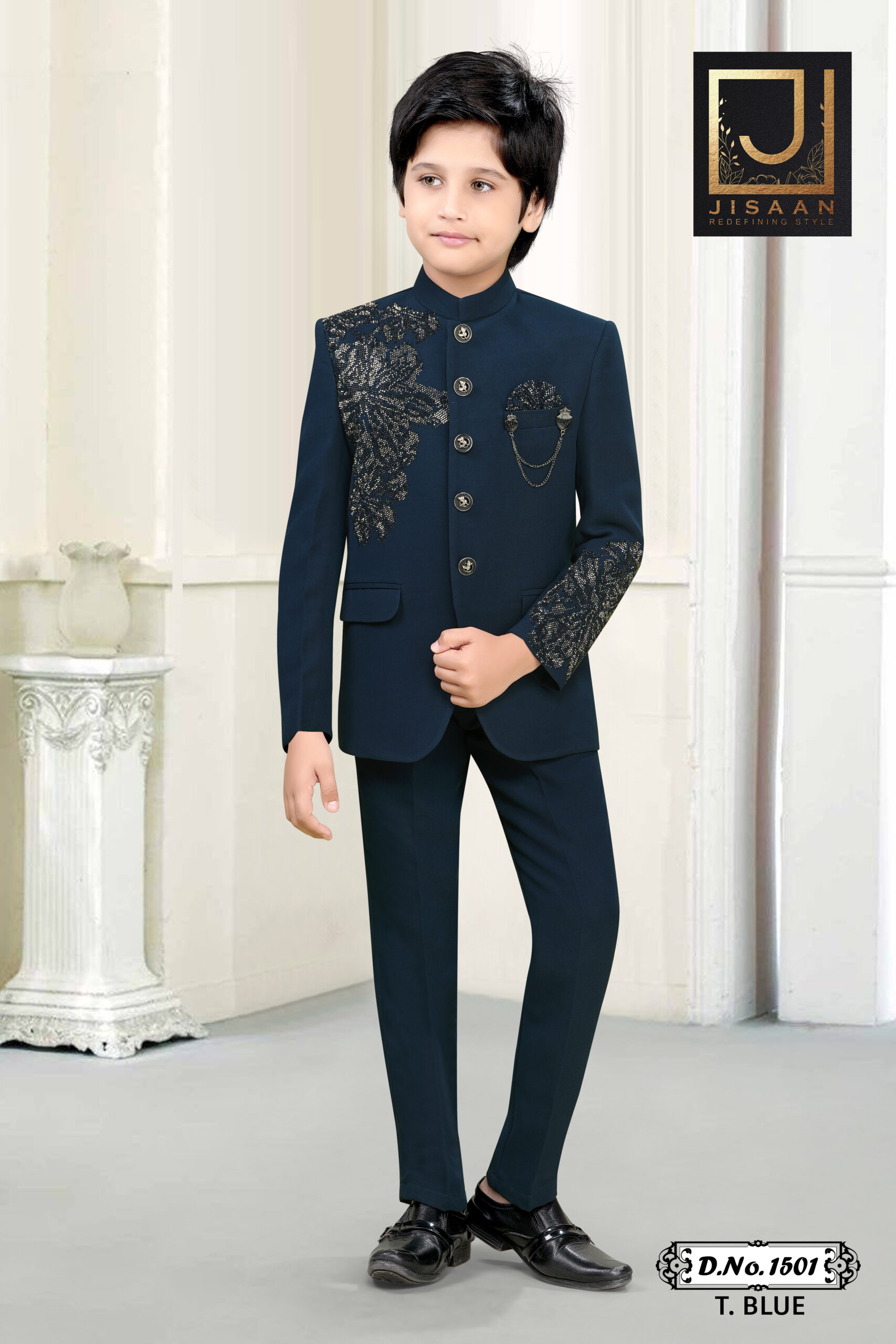 Stylish T. Blue Indo-Western suit for boys, featuring a striking embellished jacket with metallic buttons and elegant detailing—ideal for festive and formal events.